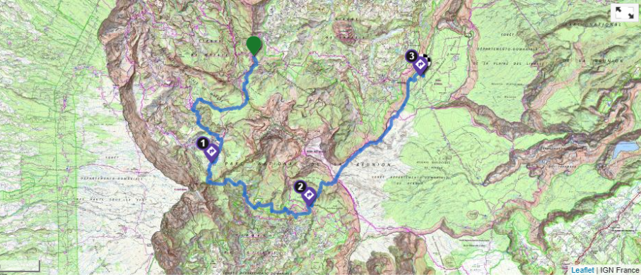 Itinéraire : Le Bélier – Pied du Piton Marmite – Plaine des Merles – Col de Fourche – Plaine des Tamarins – Plateau du chêne – La Nouvelle – Bord de Mars – Ilet Georges – Stèle Joset Ethève – Maison Laclos – Marla