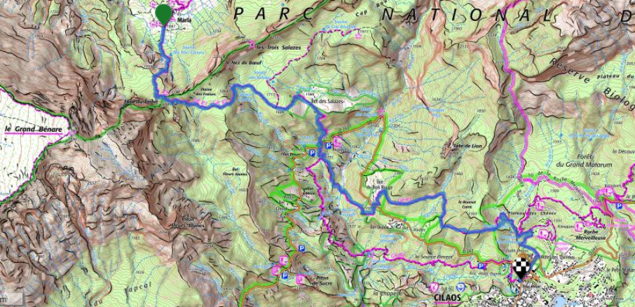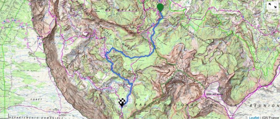 Itinéraire : Marla – Col du Taïbit – Plaine des Fraises – Ilet des Salazes – Croisée D 242 – Bras Rouge à gué – 2e croisée D 242 – Ilet du Bois rouge – Tour du Bonnet Carré – Plateau des Chênes – Hôtel des Thermes – Centre-ville de Cilaos